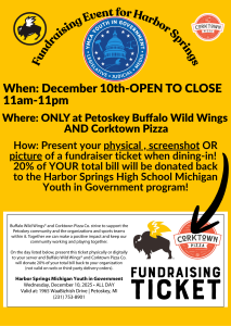 Stop out to either Buffalo Wild Wind or CorkTown Pizza in Petoskey to help support Harbor Springs Michigan Youth in Government program. Just show them your Fundraising Ticket that is attached here while dining in, and they will donate 20% of your total bill to the Harbor Springs Michigan Youth in Government.